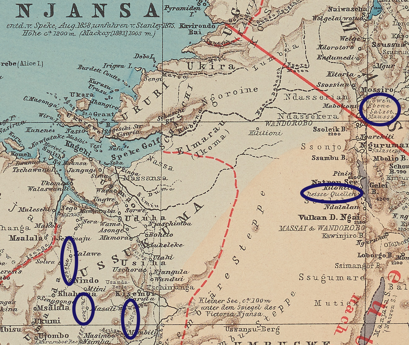 A portion of Sheet 8 of Habenicht’s Spezial-Karte von Afrika, including Lake Victoria. The circles in violet highlight information such as the presence of “Lions” or “hot springs” and the routes followed by John Hanning Speke, Wilhelm Junker and Henry Morton Stanley.